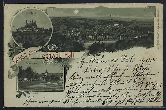 Mondschein-Lithographie Schwäb. Hall, Soolbad, Comburg, Gesamtansicht