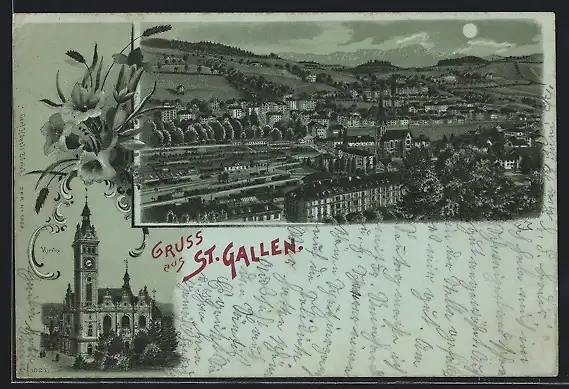 Mondschein-Lithographie St. Gallen, Stadtansicht und Kirche