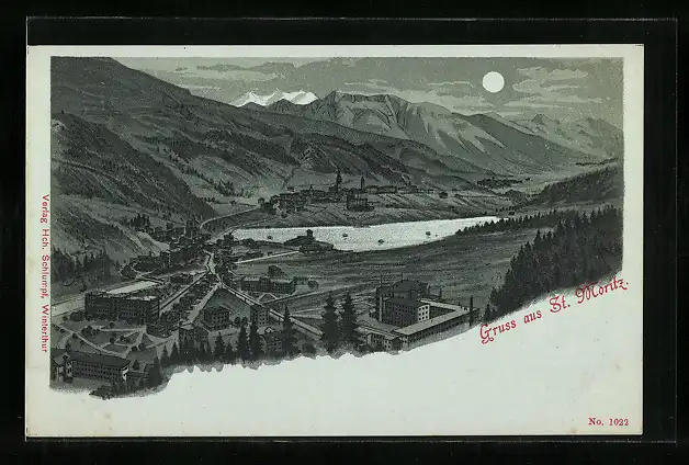 Mondschein-Lithographie St. Moritz, Panorama mit Ort, See und Gebirge