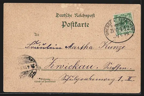 gelaufen 1899, Eckknick oben li., guter Zustand