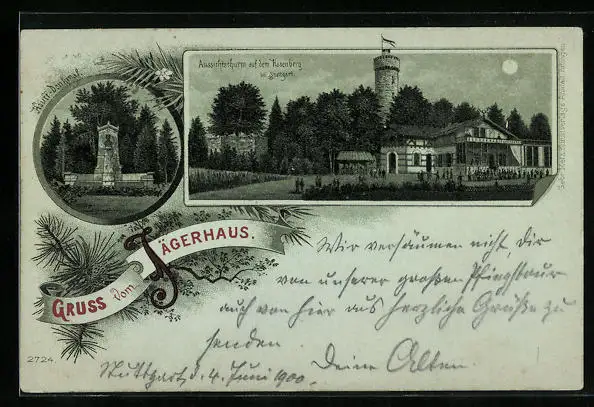 Mondschein-Lithographie Stuttgart, Gasthaus Jägerhaus, Hasenberg, Hauff-Denkmal