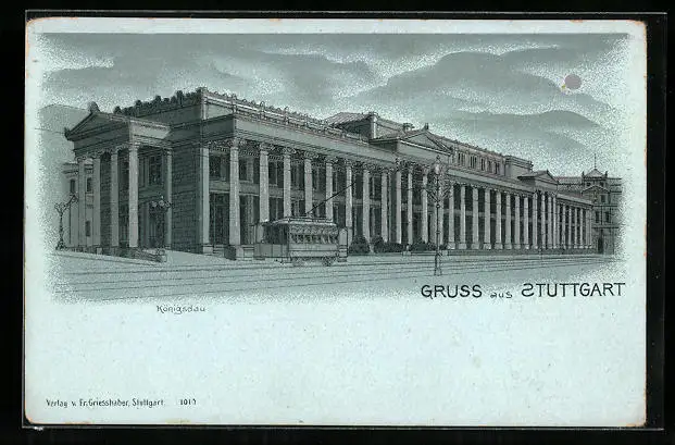 Mondschein-Lithographie Stuttgart, Königsbau mit Strassenbahn