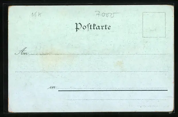 Personenbezogene Daten auf der Rückseite der Karte wurden durch blauen Textmarker unkenntlich gemacht. Die blauen Stellen sind auf die Vorderseite durchgeweicht und wirken sich negativ auf das Postkartenfoto aus