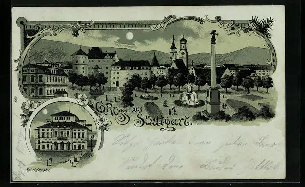 Mondschein-Lithographie Stuttgart, Ortspartie mit Denkmal, Königliches Hoftheater