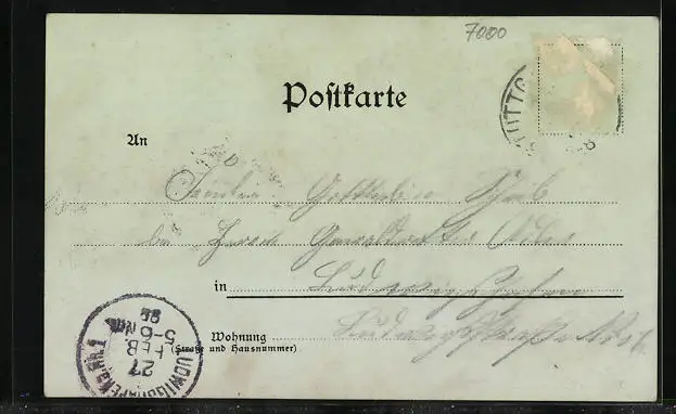 Personenbezogene Daten auf der Rückseite der Karte wurden durch blauen Textmarker unkenntlich gemacht. Die blauen Stellen sind auf die Vorderseite durchgeweicht und wirken sich negativ auf das Postkartenfoto aus