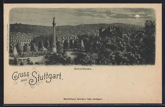 Mondschein-Lithographie Stuttgart, Schlossplatz mit Denkmal