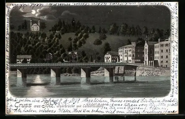 Mondschein-Lithographie Tölz, Isarbrücke mit Calvarienberg