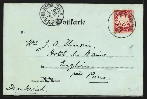 Personenbezogene Daten auf der Rückseite der Karte wurden durch blauen Textmarker unkenntlich gemacht. Die blauen Stellen sind auf die Vorderseite durchgeweicht und wirken sich negativ auf das Postkartenfoto aus
