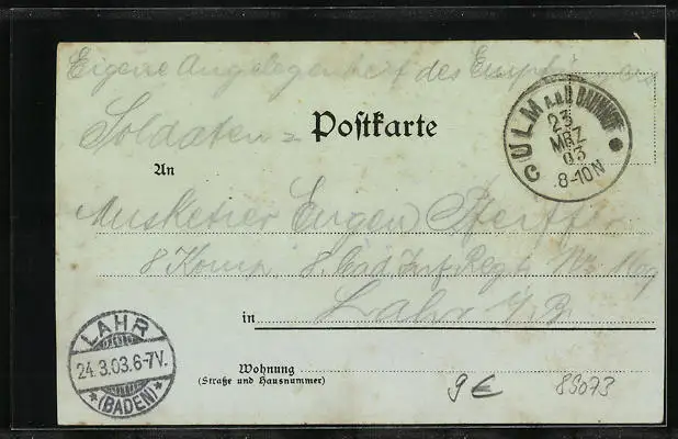 Personenbezogene Daten auf der Rückseite der Karte wurden durch blauen Textmarker unkenntlich gemacht. Die blauen Stellen sind auf die Vorderseite durchgeweicht und wirken sich negativ auf das Postkartenfoto aus