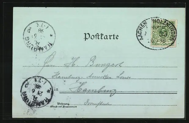 Personenbezogene Daten auf der Rückseite der Karte wurden durch blauen Textmarker unkenntlich gemacht. Die blauen Stellen sind auf die Vorderseite durchgeweicht und wirken sich negativ auf das Postkartenfoto aus