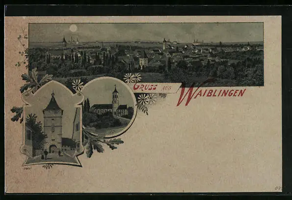 Mondschein-Lithographie Waiblingen, Kirche, Torturm, Ortsansicht