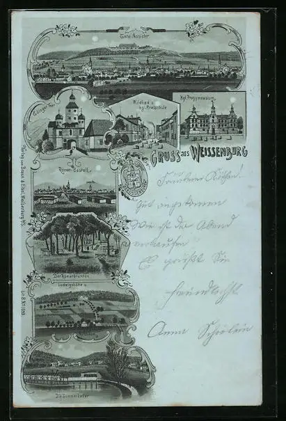 Mondschein-Lithographie Weissenburg, Römer-Castell, Wildbad und Kgl. Realschule, Ellinger Thor