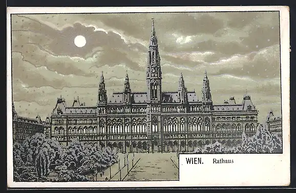 Mondschein-Lithographie Wien, Rathaus in eisiger Winternacht