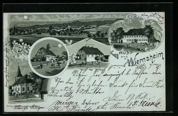 Mondschein-Lithographie Wiernsheim, Pfarrhaus, Totalansicht, Gasthaus H. Preisendanz, Kirche