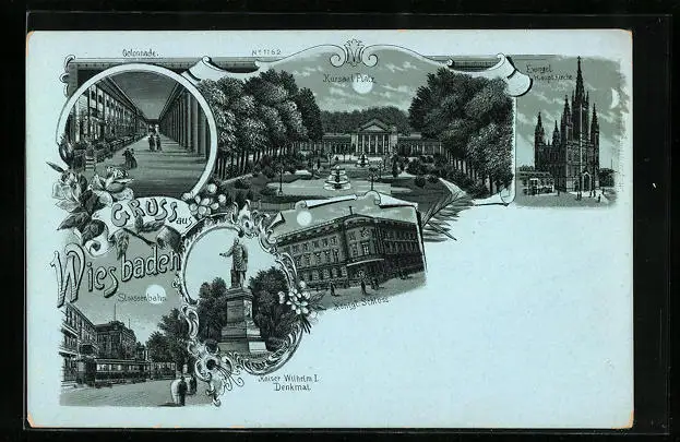 Mondschein-Lithographie Wiesbaden, Kursaal Platz, Strassenbahn, Ev. Hauptkirche