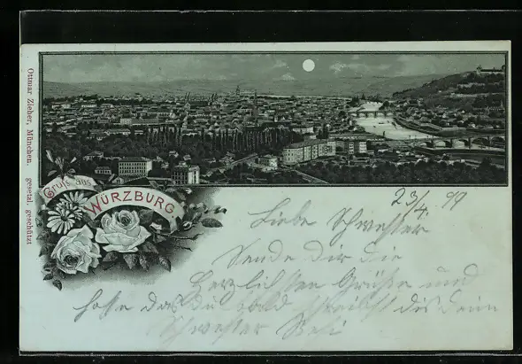Mondschein-Lithographie Würzburg, Stadtanblick im Mondlicht