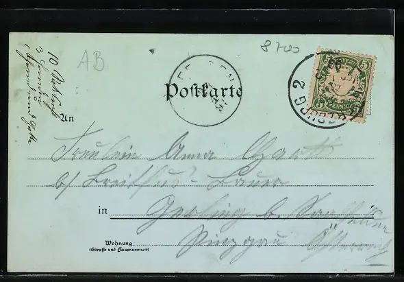 Personenbezogene Daten auf der Rückseite der Karte wurden durch blauen Textmarker unkenntlich gemacht. Die blauen Stellen sind auf die Vorderseite durchgeweicht und wirken sich negativ auf das Postkartenfoto aus