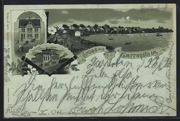 Mondschein-Lithographie Zarrentin i. M., Teilansicht, Postamt, Bahnhof