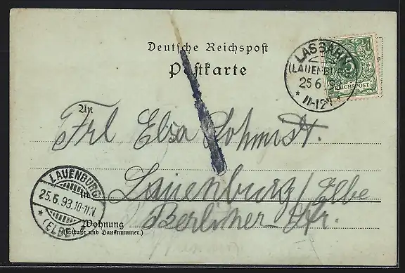 Personenbezogene Daten auf der Rückseite der Karte wurden durch blauen Textmarker unkenntlich gemacht. Die blauen Stellen sind auf die Vorderseite durchgeweicht und wirken sich negativ auf das Postkartenfoto aus
