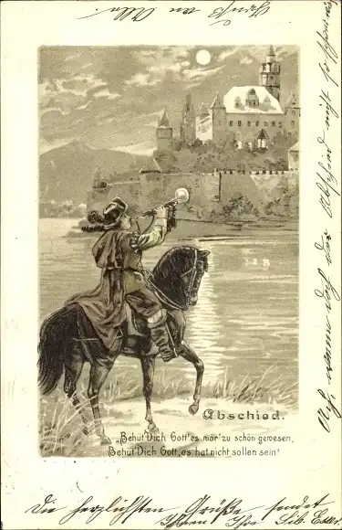 Mondschein Präge Litho Trompeter von Säckingen, Abschied, Behüt Dich Gott