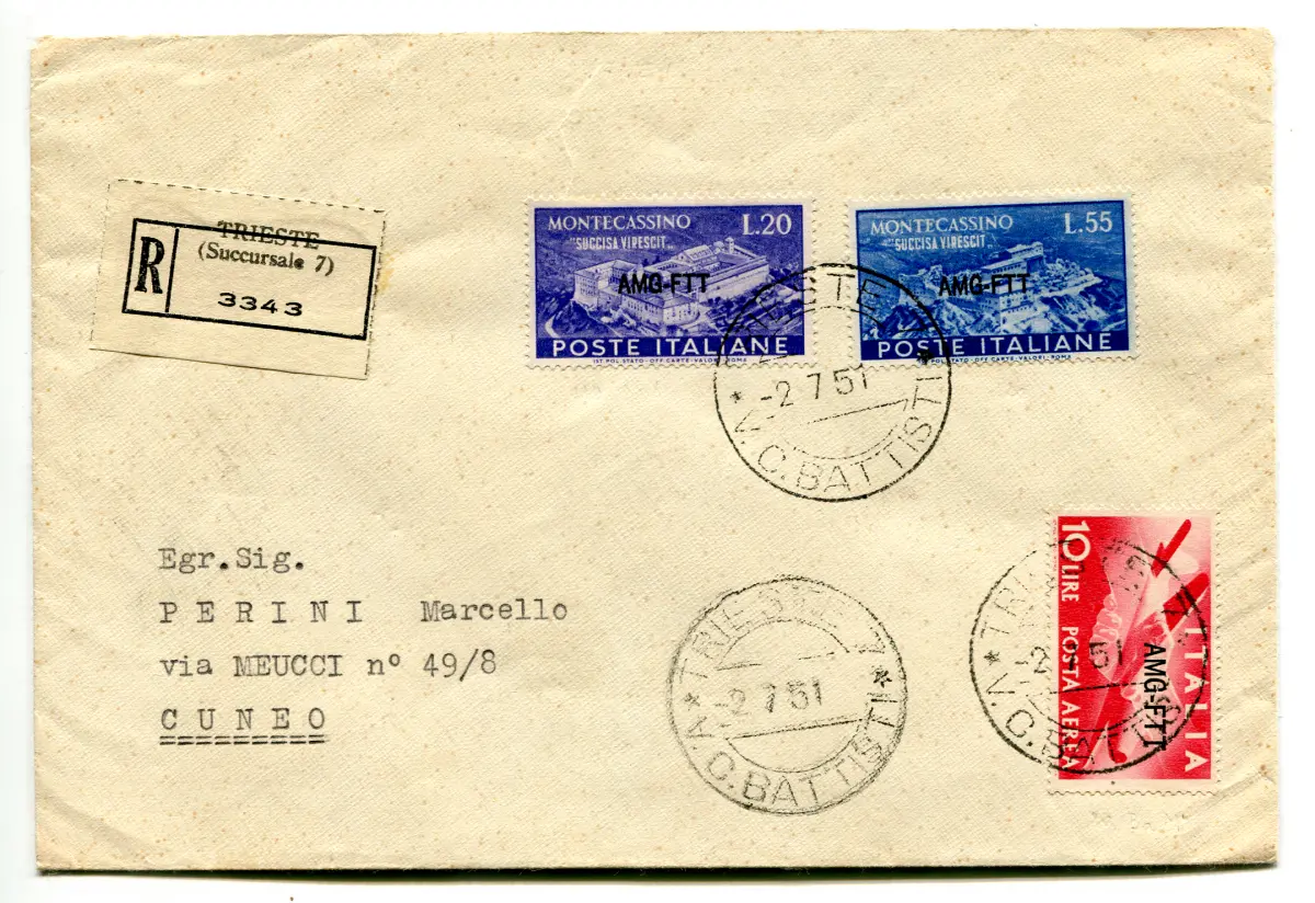 Montecassino Serie auf Einschreiben BUSTA - Montecassino Nr. Serie 119/120 + ergänzende P.A. Nr. 20 auf Einschreibenumschlag für Cuneo am 2.7.51 - Selten, im Doppeltarif - Kat. euro 260 Cod. 956/16