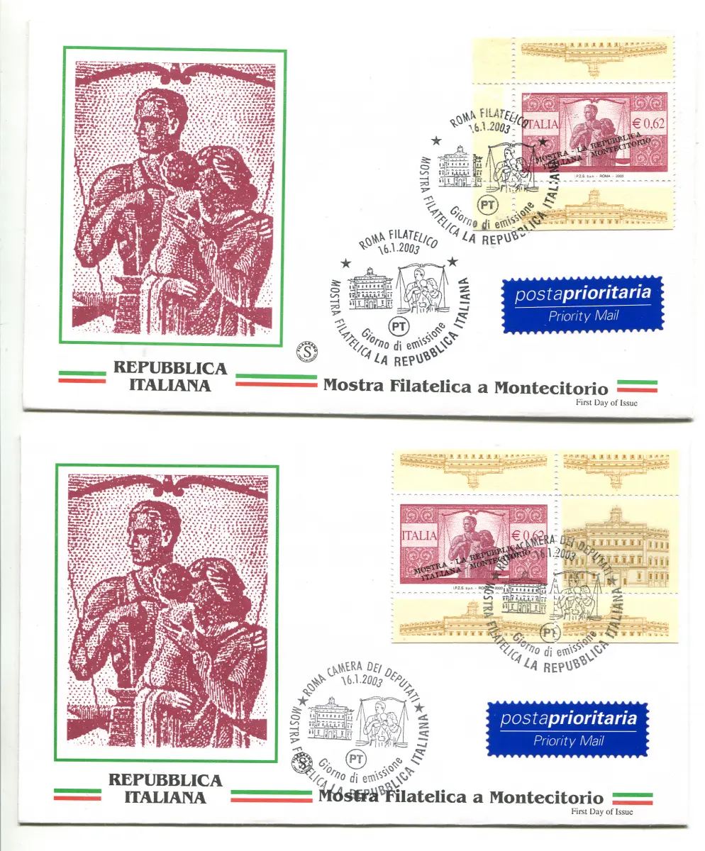 Montecitorio 2003 aus Heft Bogenwinkel auf FDC Italien - Montecitorio 2003 aus Heft - die beiden verschiedenen Blattecken auf zwei Umschlägen FDC Ausgabe Filagrano - Uncommon - Cod. 1547/WEB