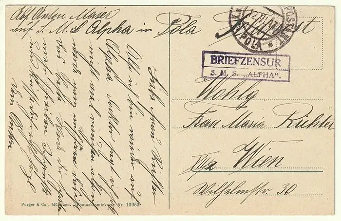 Bemerkungen: Gelaufen m. Stempel: Briefzensur/S.M:S. Alpha. Kastenst. zweizeilig schwarz - KALIS 6-P.15 neben K.u.k. MFPA/12. VI. 17/Pola. 1883 Radyachtdampfer Greif. Hulk-Torpedoschule.
