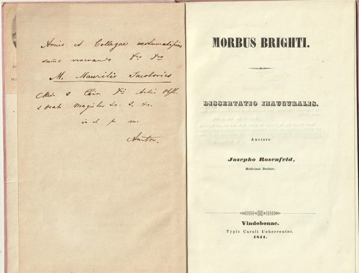 Bemerkungen: Dissertation von Joseph Rosenfeld über die sog. Bright-Krankheit, eine Art Nierenentzündung, die nach dem britischen Arzt Richard Bright (1789-1858) benannt worden war. Flieg. Vorsatzbl. mit handschriftl. Widmung des Verfassers an seinen Freund und Kollegen Moritz Jacobovics, der u. a. Chirurg und Sekundararzt am Wiener allgem. Krankenhaus war.