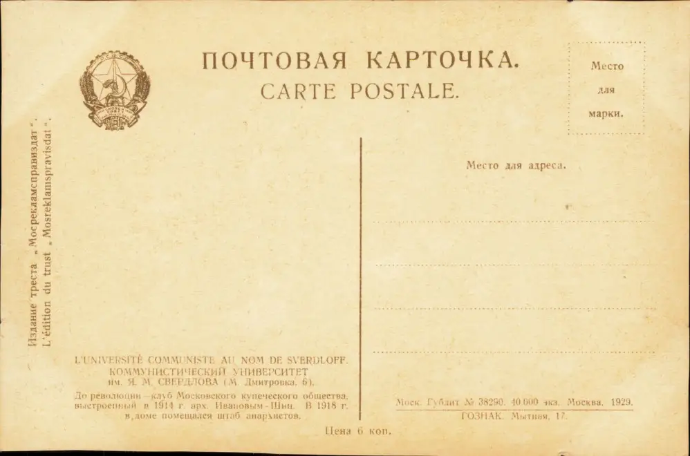 Moskau Москва́ L'UNIVERSITÉ COMMUNISTE AU NOM DE SVERDLOFF 1929