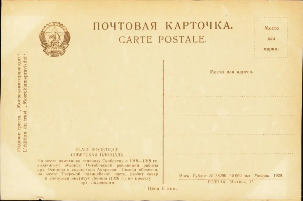 Moskau Москва́ PLACE SOVIETIQUE. СОВЕТСКАЯ ПЛОЩАДЬ. 1929