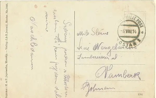 Bemerkungen: Gelaufen 1914, Mostar - Vamberk, Milit. Post.