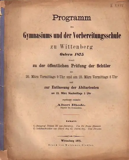Titel: Burggraf Johann III. von Nürnberg. In: Programm des Gymnasiums und der Vorbereitungsschule zu Wittenberg Ostern 1875 womit zu der öffentlichen Prüfung der Schüler am 20. März Vormittags 9 Uhr und am 23. März Vormittags 8 Uhr zur Entlassung der Abiturienten am 23. März Nachmittags 3 Uhr ergebenst einladet Albert Rhode