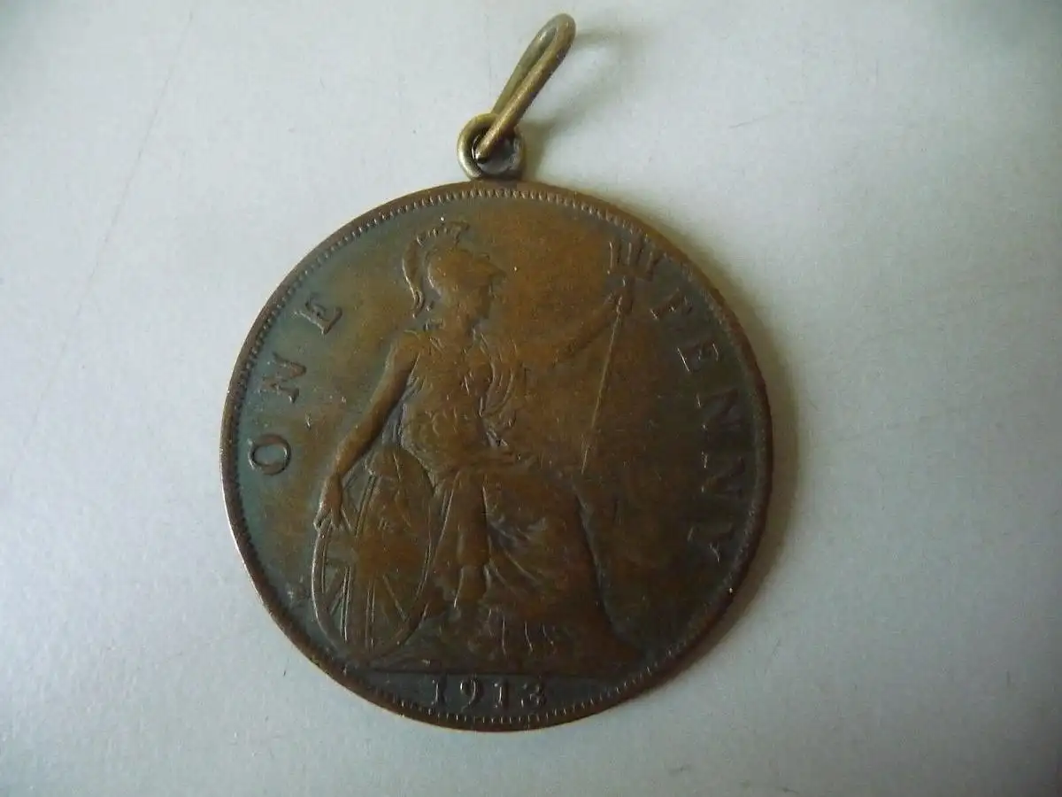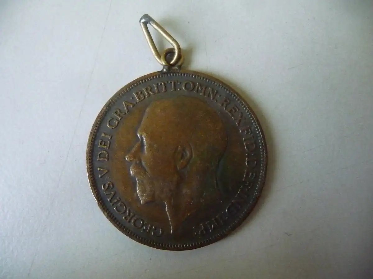 One-Penny Münze mit Ring als Anhänger gefasst, 1913 Umschrift: Georgius V Dei Gra: Britt: Omn: Rex Fid: Def: Ind: Imp Durchmesser ca. 31 mm Mit Altersspuren, Oxidationsflecken
