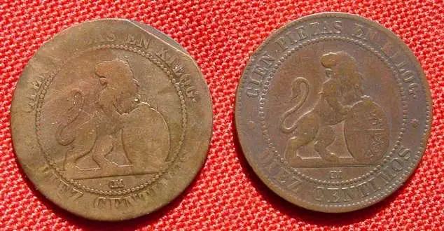 Muenze Spanien 10 Centimos 1870 (1038277) Gratis dazu gibt es die stärker gebrauchte Muenze (mit dem Randfehler). Siehe bitte Bilder