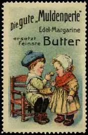 Die gute Muldenperle Edel-Margarine ersetzt feinste Butter, Kinder, Größe/Zustand: 5x4 , guter Zustand, Original alte Reklamemarke die seinerzeit für die Werbung benutzt wurde