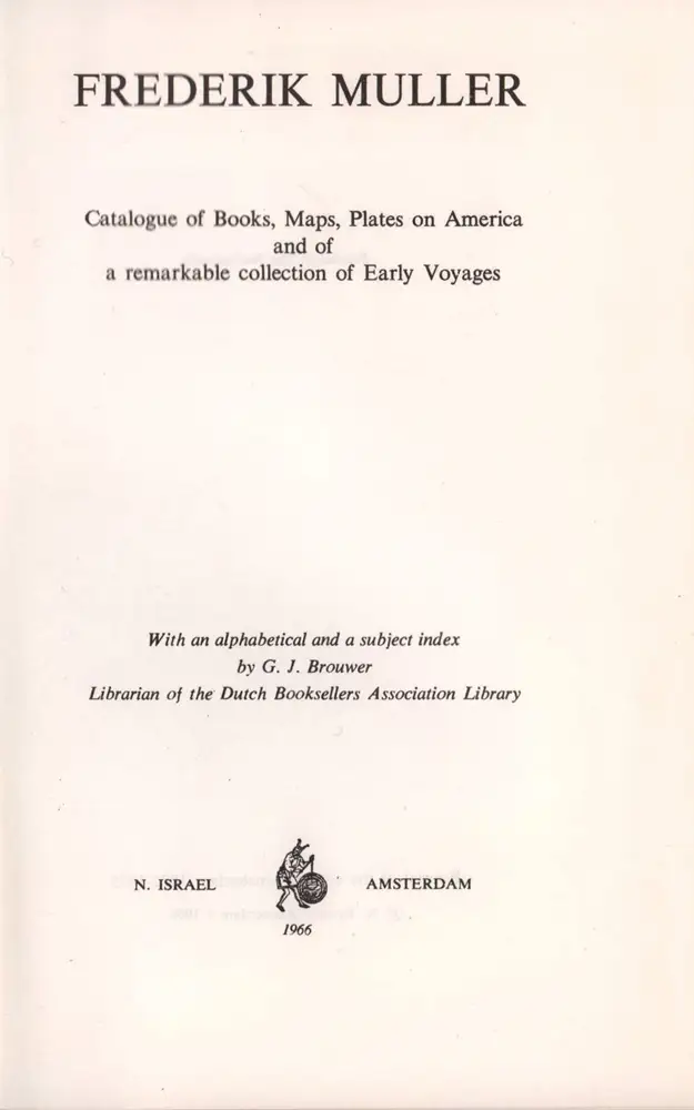 Muller, Frederik: Catalogue of books, maps, plates on America, and of a remarkable collection of early voyages. With an alphabetical and a subject index by G. J. Brouwer.