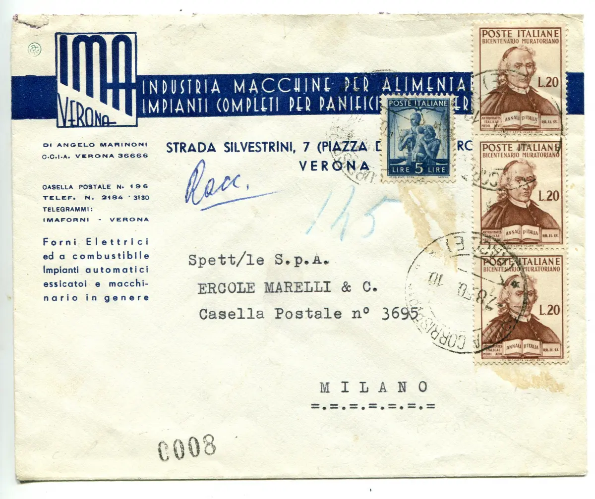 Muratori Lire 20 Dreierstreifen auf Umschlag - Muratori Lire 20 Nr. 625 Dreierstreifen + Ergänzung Nr. 555 auf Umschlag Racc. für Mailand am 7.8.50 - Uncommon Cod. 272/13