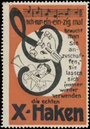 X-Haken für Musikinstrumente, Größe/Zustand: 6x4 , guter Zustand, Original alte Reklamemarke die seinerzeit für die Werbung benutzt wurde