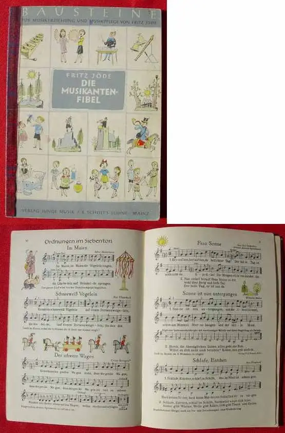 "Die Musikanten-Fibel" Von Fritz Joede. Erstes Sing- und Spielbuch fuer die Schule. 40 Seiten, zahlreiche kleine mehrfarbige Bildchen. Verlag Junge Musik / B. Schott"s Soehne Mainz. Vermutlich um 1960 ? Umschlag mit Klebefolie verstaerkt
