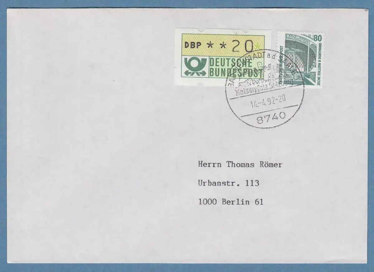 NAGLER-ATM Mi.-Nr. 1.2 Wert 20 in MIF auf Drucksache, FDC Bad Neustadt 14.4.92