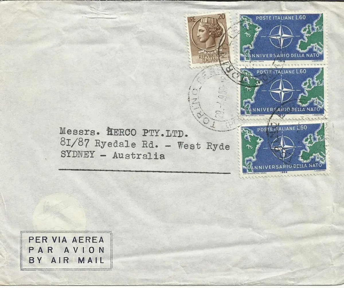 N.A.T.O. Lesen Sie 60 drei Exemplare + Ergänzung auf Luftumschlag für Australien - N.A.T.O. Lire 60 Nr. 855 drei Exemplare + Ergänzung Nr. 768 auf Luftumschlag für Australien am 29.4.59 Nr. 551/5