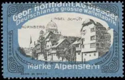 Deutschlands grösste Waffelfabrik, Waffeln Marke Alpenstern, Größe/Zustand: 3x5 , Fehldruck, guter Zustand, Original alte Reklamemarke die seinerzeit für die Werbung benutzt wurde