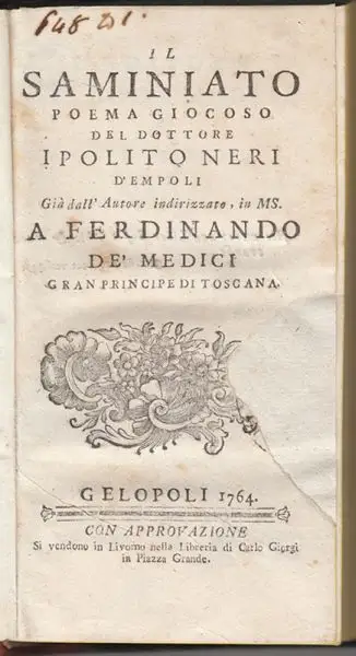 Bemerkungen: Ippolito Neri, geb. in Empoli 1652, gest. 1708 dortselbst war Hofarzt. Das posthum veröffentlichte, satirische Epos Il Saminiato war sein einziges literarisches Werk. Stoff dieser heroischen Dichtung ist die Besetzung von San Miniato seitens der Empolesi.