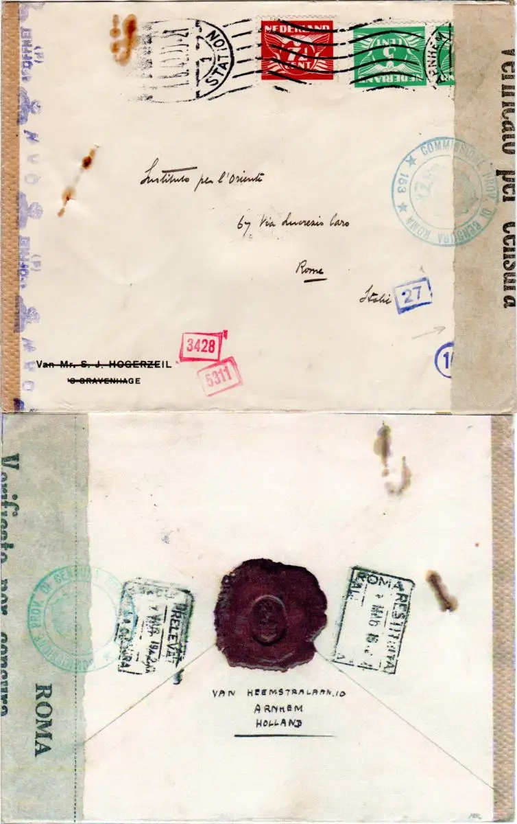 Paar 5+7 1/2 Ct. auf gesiegeltem Brief m. dt. OKW u. Italien Rom Zensuren.