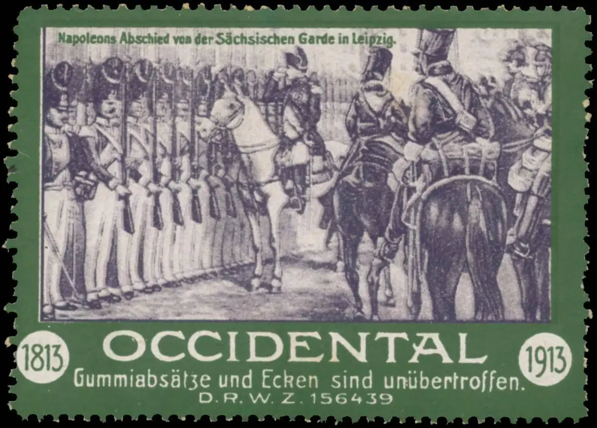 Occidental Gummiabsätze- und Ecken sind unübertroffen! Schuhabsätze, Absatz, Befreiungskriege, Napoleon, Größe/Zustand: 5x6 , guter Zustand, Original alte Reklamemarke die seinerzeit für die Werbung benutzt wurde