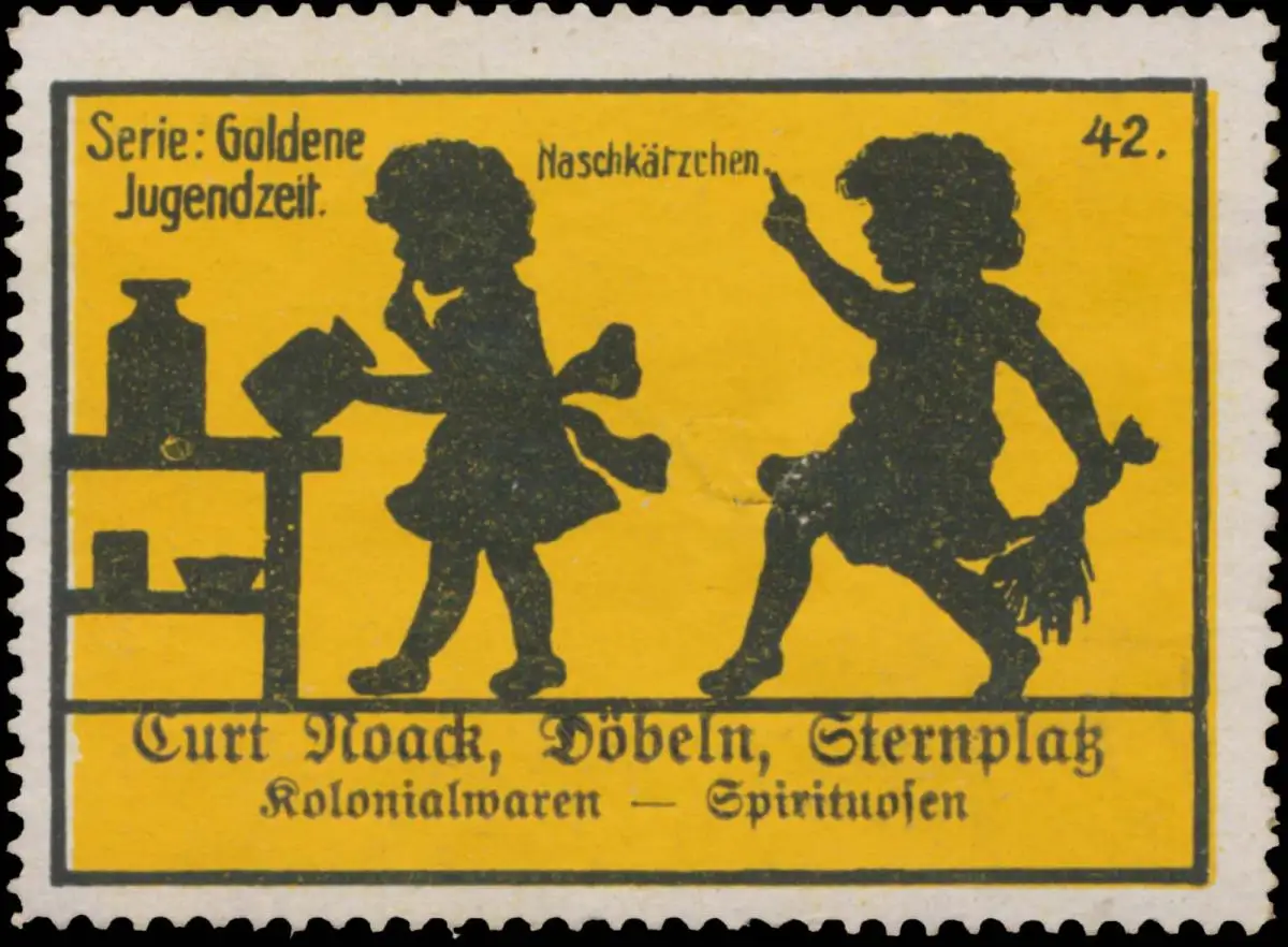 Kinder-Serie: Goldene Jugendzeit, 42, Kolonialwaren, Spirituosen Curt Noack, Sternplatz, Größe/Zustand: 4x6 , beschädigt, Original alte Reklamemarke die seinerzeit für die Werbung benutzt wurde