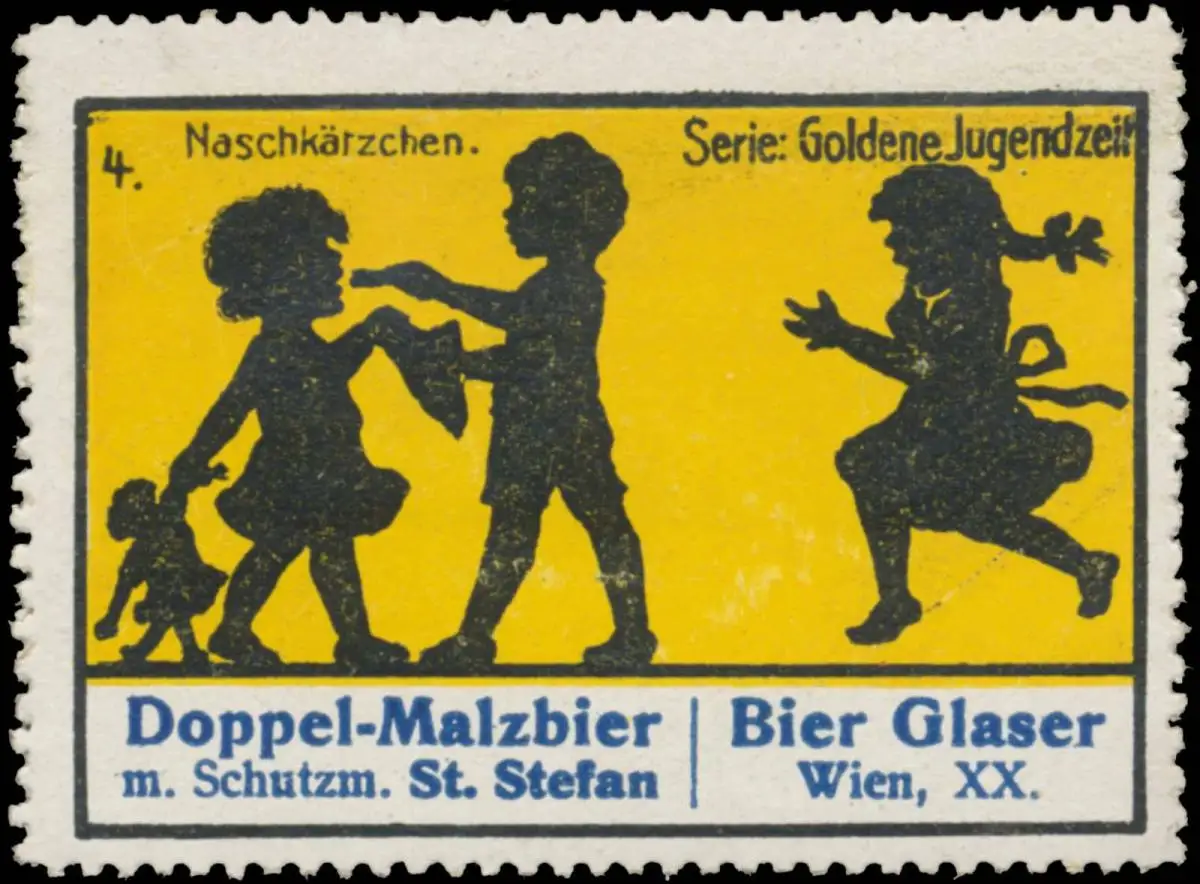 Doppel-Malzbier mit Schutzmarke St. Stefan, Serie: Goldene Jugendzeit, Kinder, Bild 4, Größe/Zustand: 4x6 , guter Zustand, Original alte Reklamemarke die seinerzeit für die Werbung benutzt wurde
