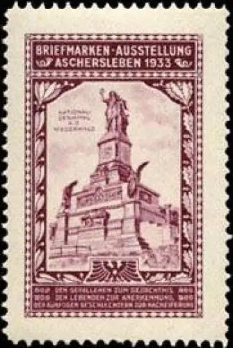 Den Gefallenen zum Gedächtnis, den Lebenden zur Anerkennung. Den künftigen Geschechtern zur Nacheiferung. Briefmarken - Ausstellung, braun, Niederwalddenkmal, Größe/Zustand: 5x3 , guter Zustand, Original alte Reklamemarke die seinerzeit für die Werbung benutzt wurde