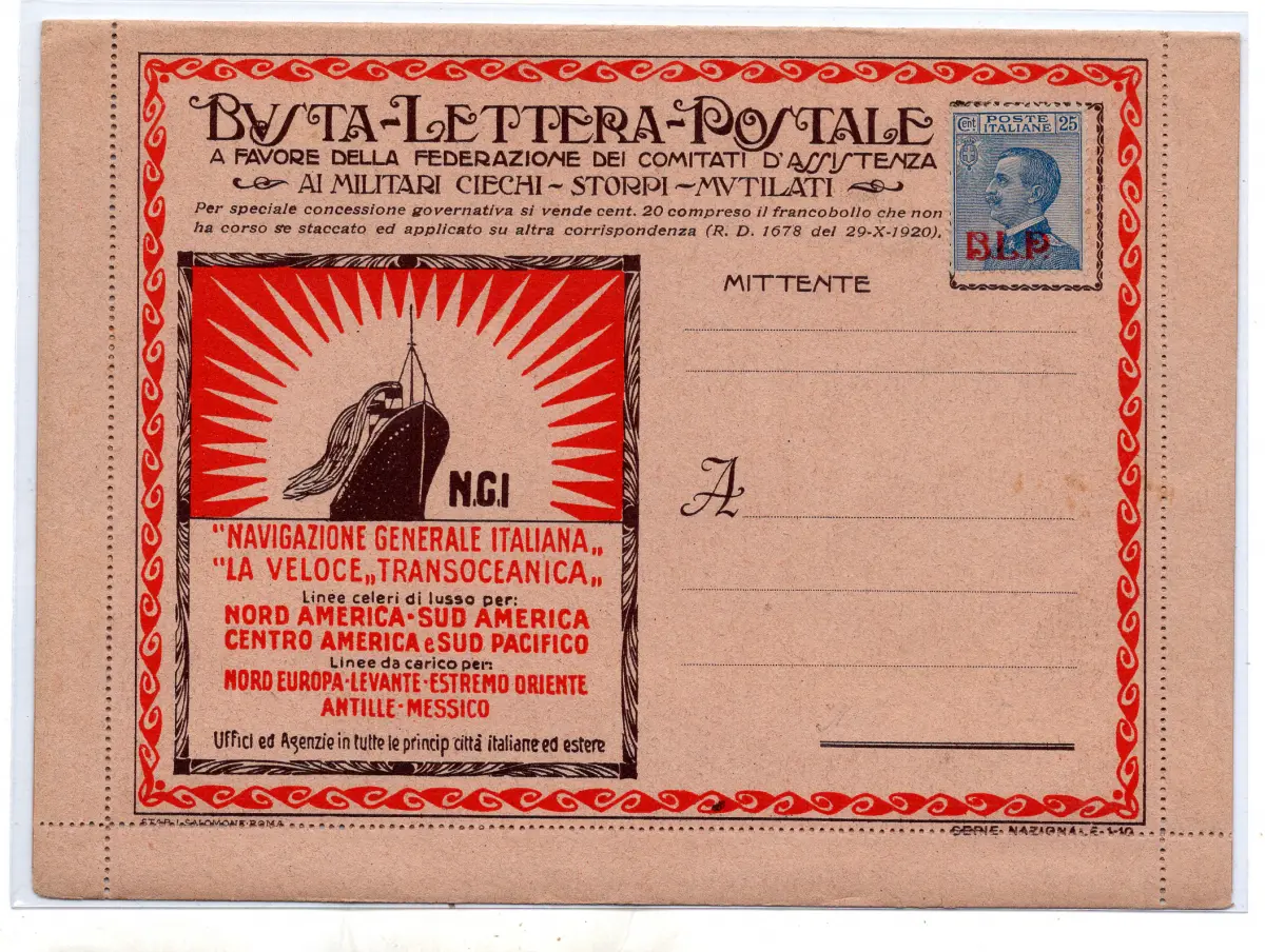 Nazionale 1-10 Navazione Italiana - B.L.P (gelber Karton) frankiert mit Cent. 25 Nr. 3 nicht gereist, mit Innenbogen - Qualität: Perfekt, Briefmarke gut zentriert, aber mit leichtem Verzahnungsfehler Cod.196/182