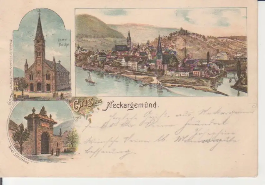 Neckargemünd Litho Kath. Kirche Altes Stadttor Panorama gl1897 226.016